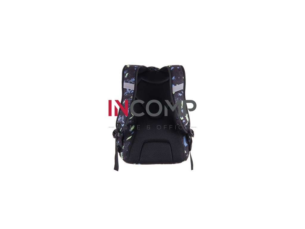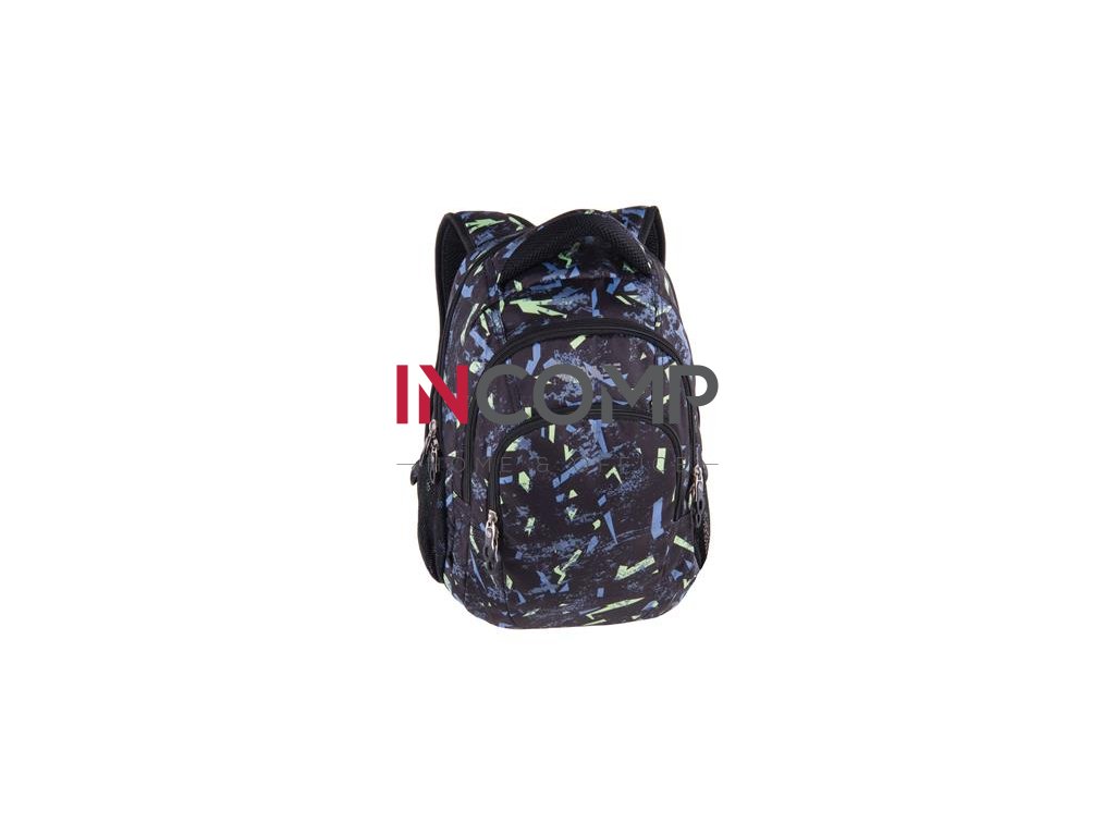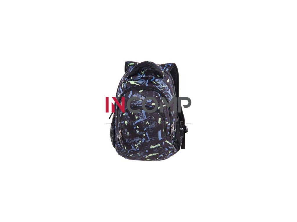 -priehradky: 2 hlavné + 1 predné + 2 bočné vrecká -ramenný popruh v tvare banánu -sieťovaný priedušný chrbát -3-vrstvové dvojité dno -vrecko na médiá -kovový zips -materiál: 600 d polyester -rozmer: 43x28x22 cm -váha: 0,65 kg