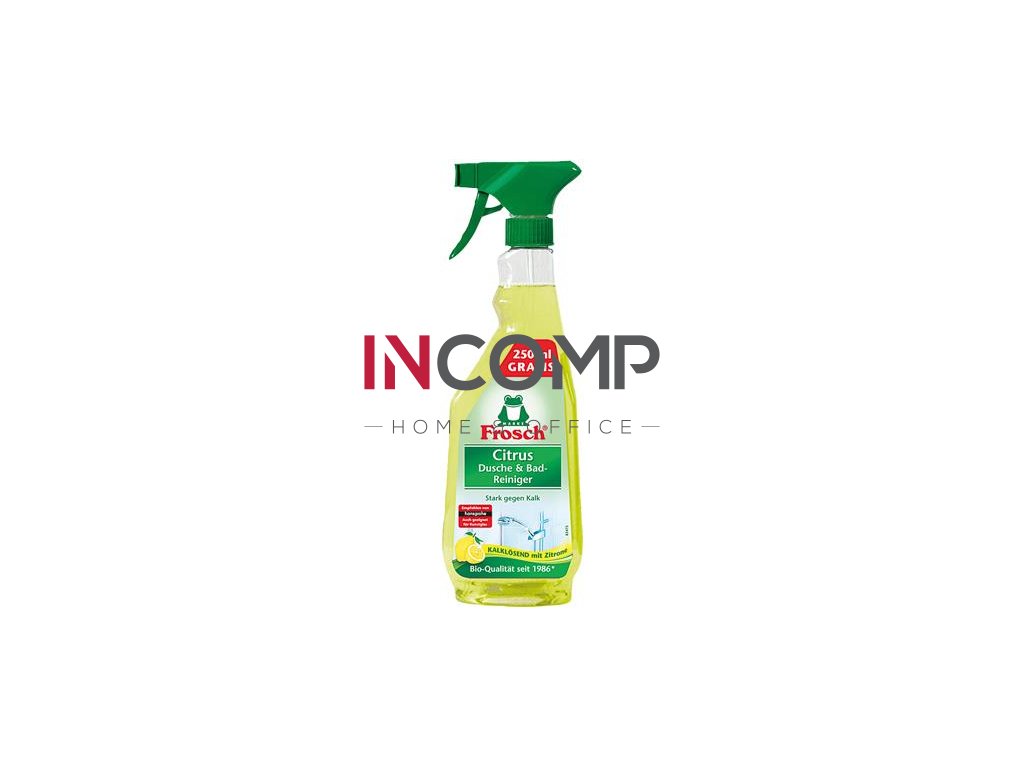 Kúpeľňový čistič Frosch efektívne odstraňuje vodný kameň. Použiteľný na odstránenie zvyškov mydla, škvń a iných nečistôt.