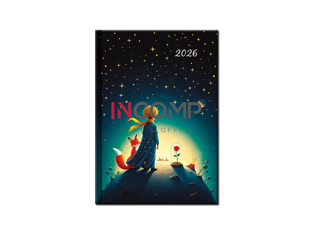 Exkluzívny denný diár s motívom MALÝ PRINC. Diár je v pevnej väzbe s prednou penou, soft touch laminom a zlatou, striebornou razbou. Slovenské kalendárium.
