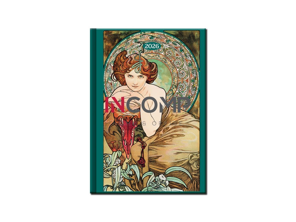 Exkluzívny denný diár s motívom ALFONZA MUCHU. Diár je v pevnej väzbe s prednou penou, soft touch laminom so zelenou a medenou razbou. Slovenské kalendárium.