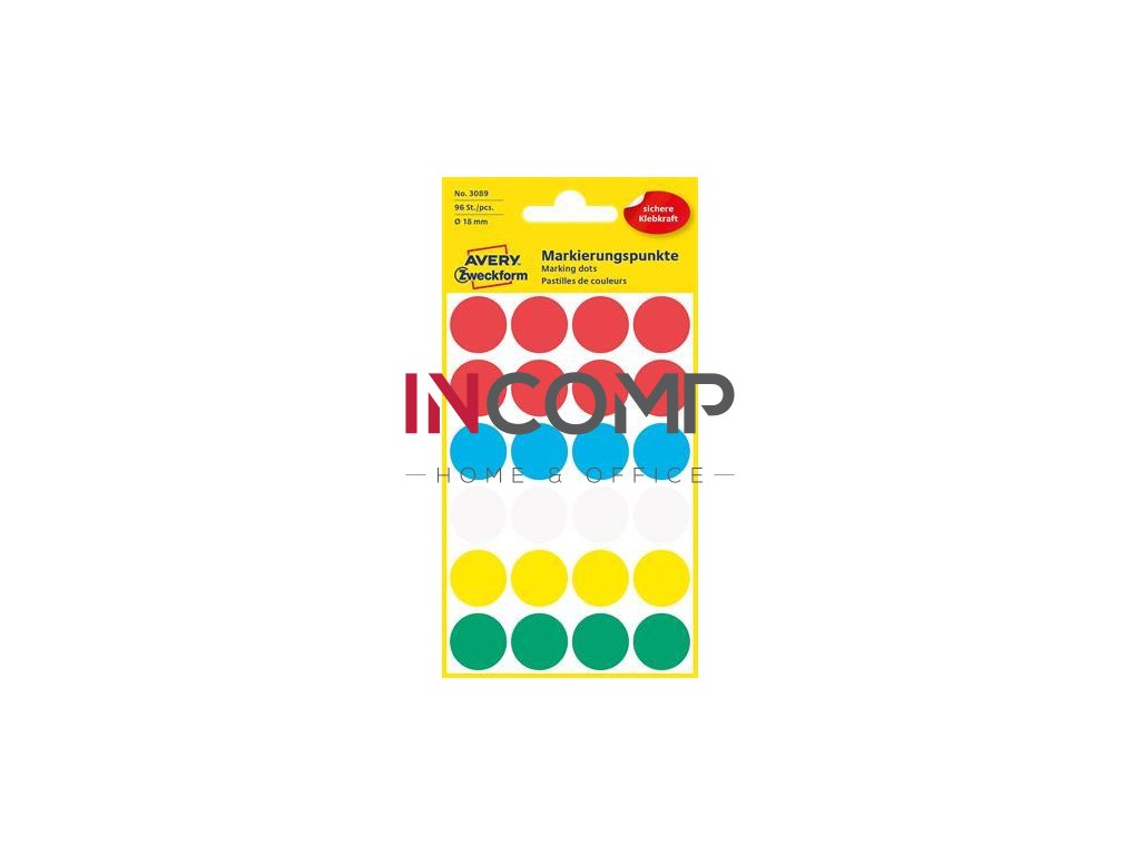 Etikety, okrúhle, priemer: 18 mm, AVERY ZWECKFORM, 5 rôznych farieb, 96 etikiet/bal