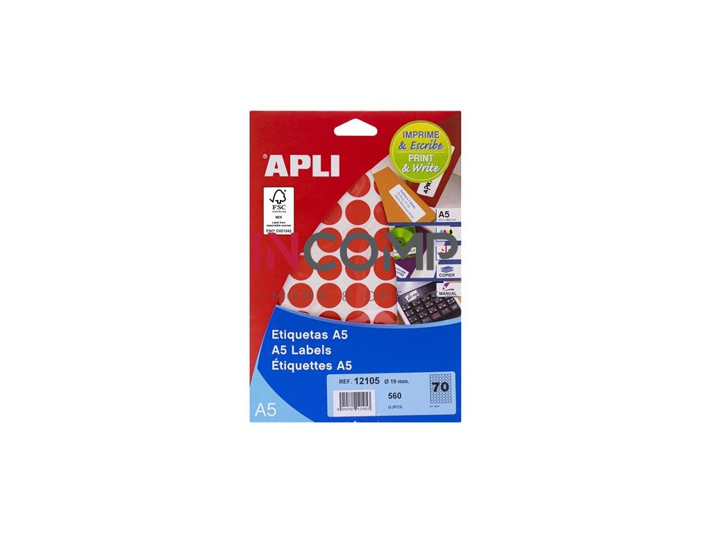 Etikety, okrúhle, priemer: 19 mm, farebné, na liste formátu A5, APLI, červené, 560 etikiet/bal