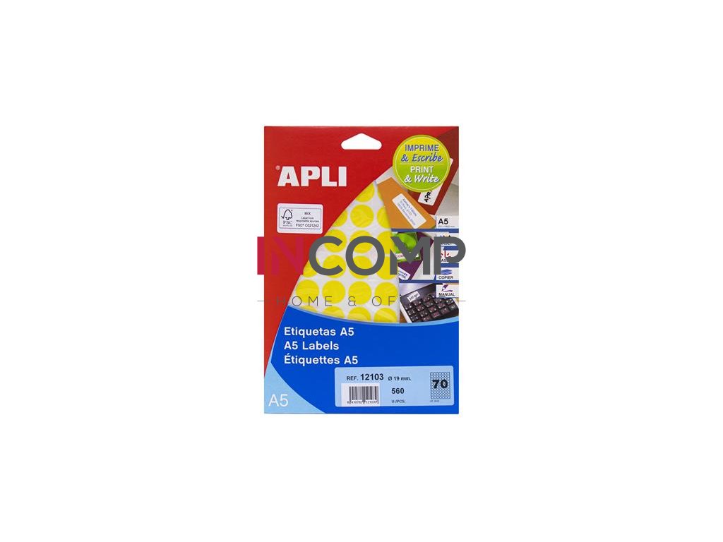 Etikety, okrúhle, priemer: 19 mm, farebné, na liste formátu A5, APLI, žlté, 560 etikiet/bal