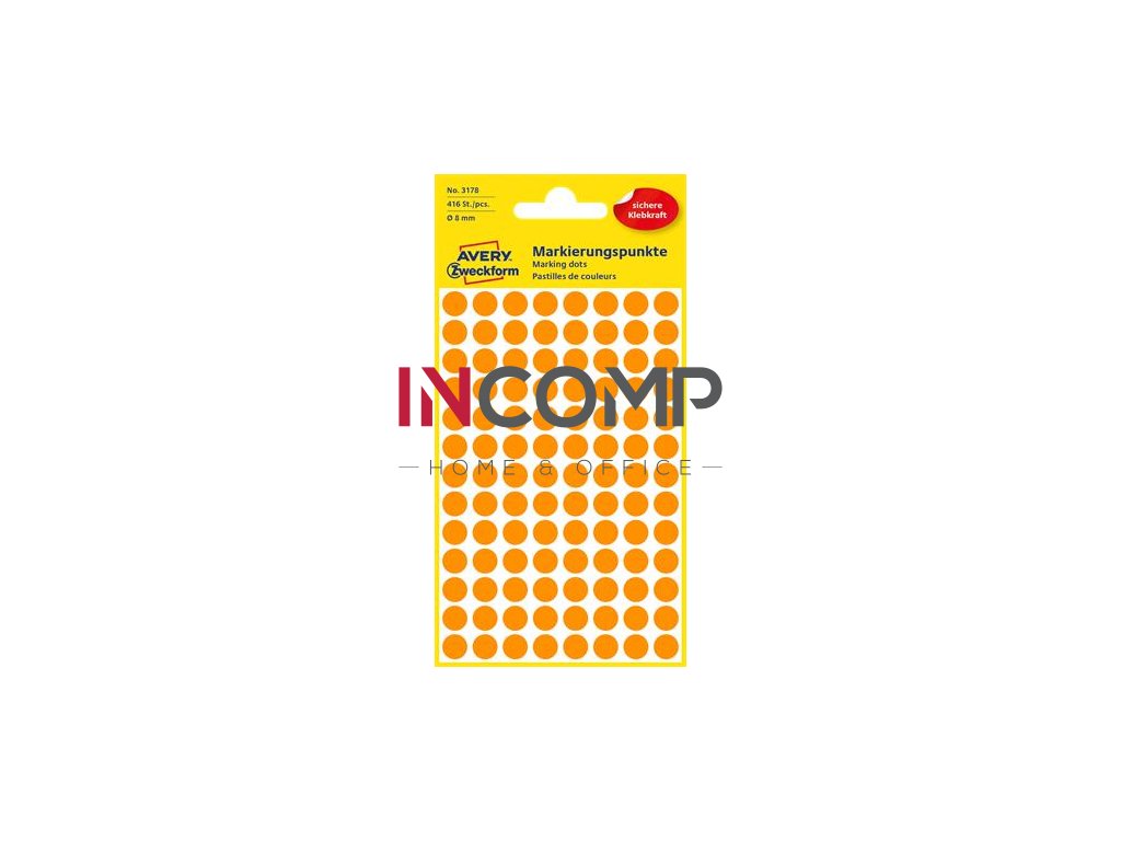 Etikety, okrúhle, priemer: 8 mm, AVERY ZWECKFORM, neónovo oranžové, 416 etikiet/bal
