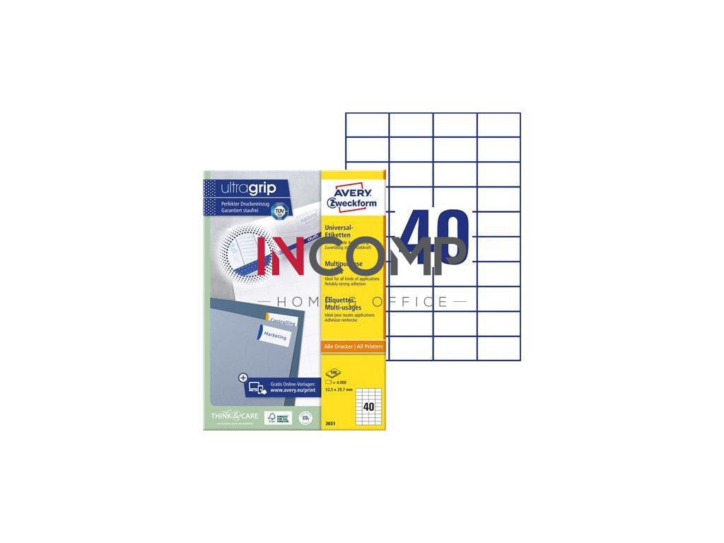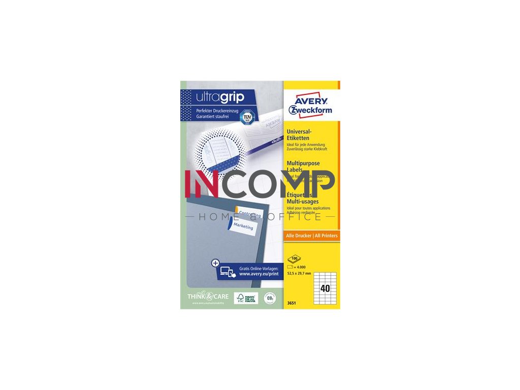 Presné dávkovanie a zaručene bezproblémová tlač vďaka inovatívnej technológii ultragrip®. -ideálne na všeobecné označovanie, napr. na organizáciu, evidenciu a značenie -farba: biela -rozmery: 52,5x29,7 mm -tvar: štvorcový -materiál: ekologický papier s certifikátom FSC®, z udržateľne obhospodarovaných lesov-vhodné pre všetky štandardné laserové a atramentové tlačiarne -bezproblémový chod v laserových tlačiarňach, potvrdený certifikátom TÜV SÜD -bezpečnostný okraj QCT zabraňuje vniknutiu zvyškov lepidla do tlačiarne -extra silná priľnavosť: etikety spoľahlivo držia na papieri, kartóne, skle aj plaste