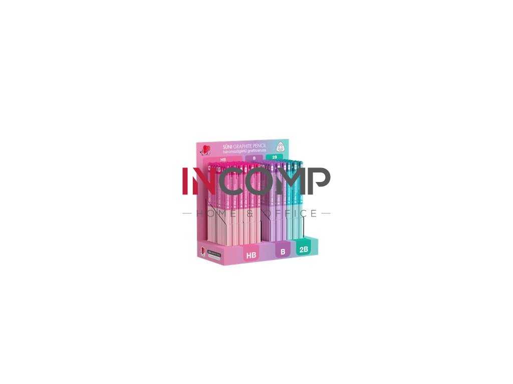 obsah displeja: 92 ks pastelovo ružových HB, 46 ks pastelovo fialových B, 46 ks mentolovo zelených 2B grafitových ceruziek