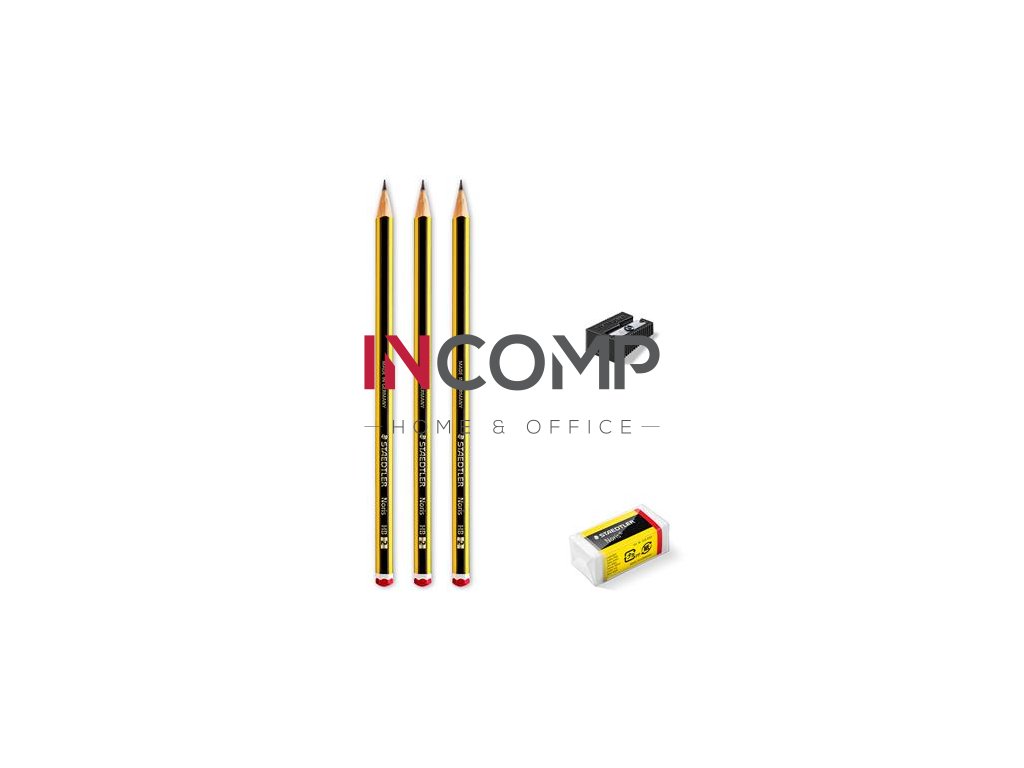- výročná sada Noris obsahuje 3 grafitové ceruzky s tvrdosťou HB, 1 x čierne, jednodierové strúhadlo a gumu