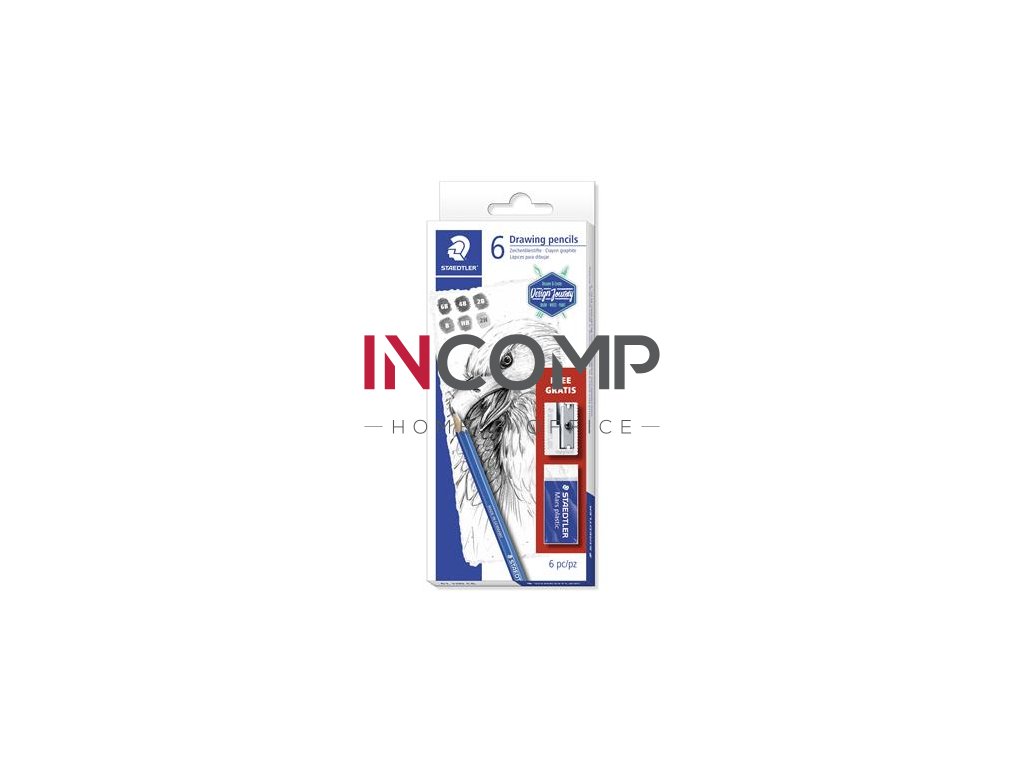 sada obsahuje 6 rôznych ceruziek tvrdosti (2H, HB, B, 2B, 4B, 6B), jedno strúhadlo a jedna guma