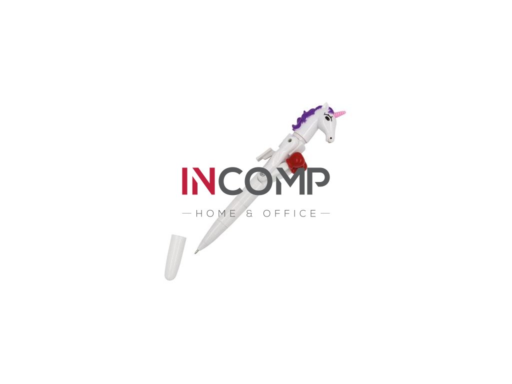 Guľôčkové pero v tvare jednorožca, ramená sa dajú pohybovať pomocou tlačidiel na zadnej strane pera. Nozdry postavičky sa rozsvietia červeným LED svetlom. - plastové telo pera - s uzáverom - hrúbka čiary: 1 mm - farba atramentu: modrá - 2 batérie LR41 sú súčasťou balenia, batérie nie sú vymeniteľné - veľkosť: cca. 18,5 x 14 x 31 cm - telo pera biele alebo ružové, farbu nemožno vybrať
