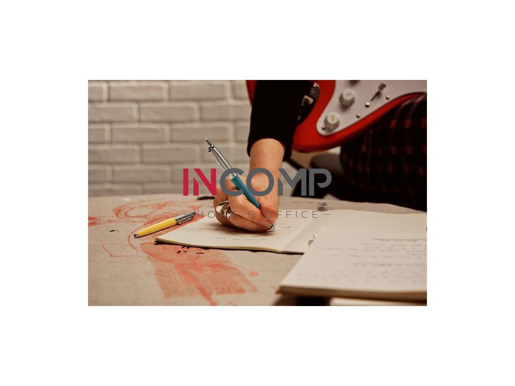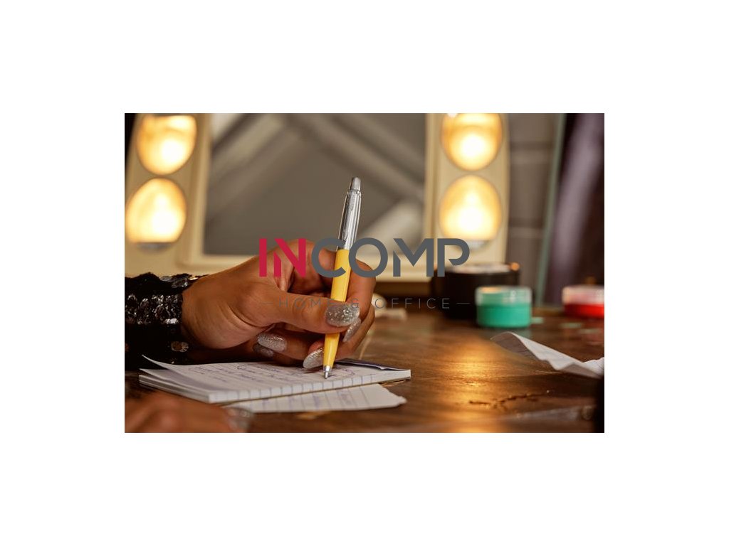 Guľôčkové pero, sada, 0,7 mm, strieborný klip, žlté a modré telo pera, PARKER "Jotter Glam Rock", modré