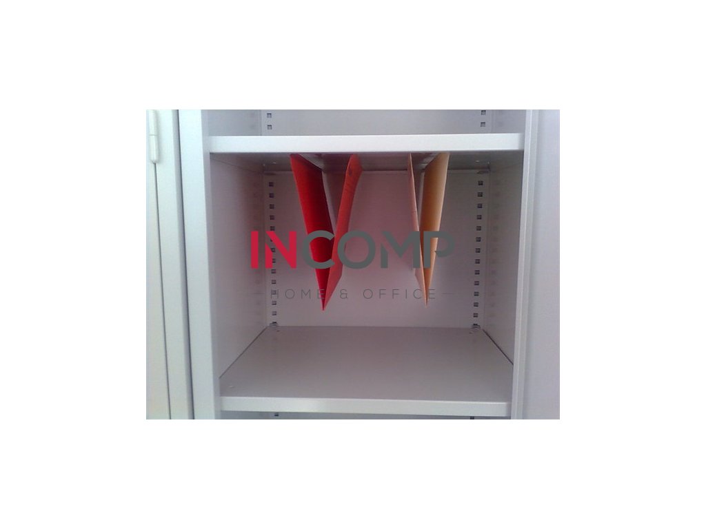 materiál: oceľ, kľúčom uzamykateľná, 2 bodová bezečnosť, 4 police, pod police sa dajú zavesiť závesné zakladacie dosky, police sa dajú nastaviť po 25 mm, nosnosť políc: 60 kg/polica (pri rovnomernom zaťažení), rozmery: 505 x 1950 x 400 mm (šírka x výška x hrúbka)