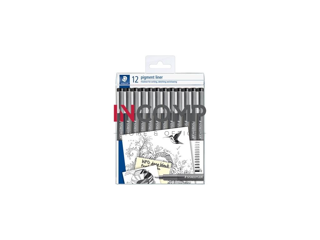 Liner, sada, 12 rôznych hrúbok, STAEDTLER "Pigment Liner 308", čierna