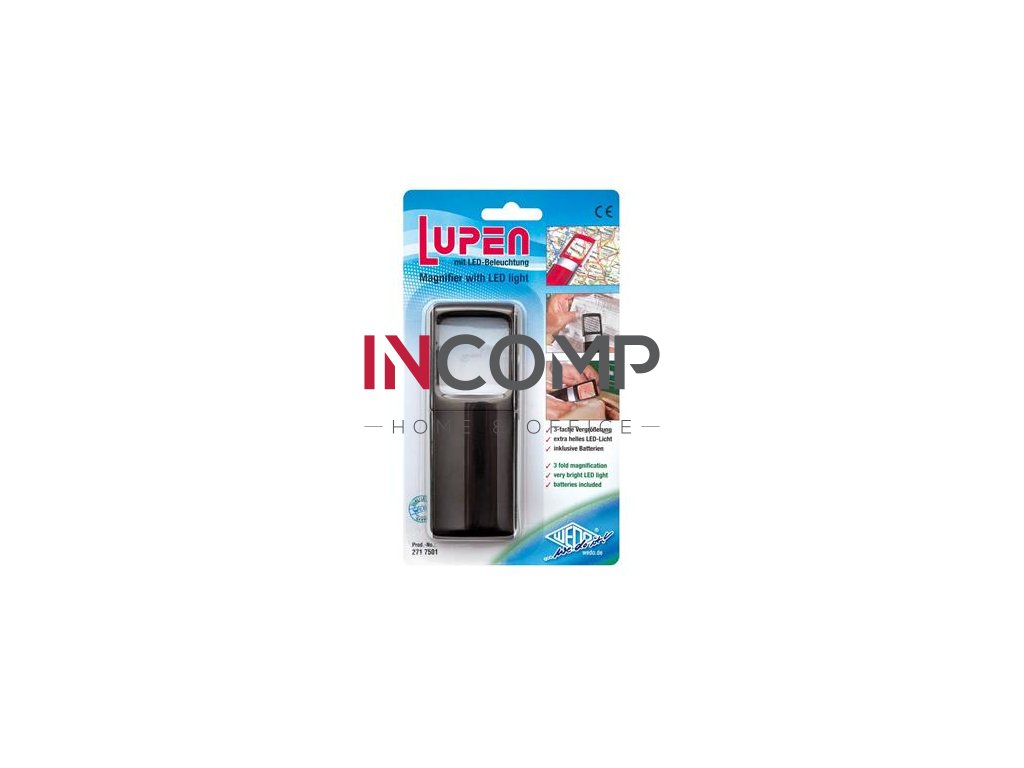 Štýlová lupa s extra bielym LED svetlom. - s plastovou šošovkou - veľkosť šošovky: 3,5 x 3,8 cm - trojnásobné zväčšenie - súčasťou sú 2 batérie 3V CR1220 - veľkosť lupy: 11,8 x 4,7 x 1,4 cm - čierna farba - hmotnosť: 48 g
