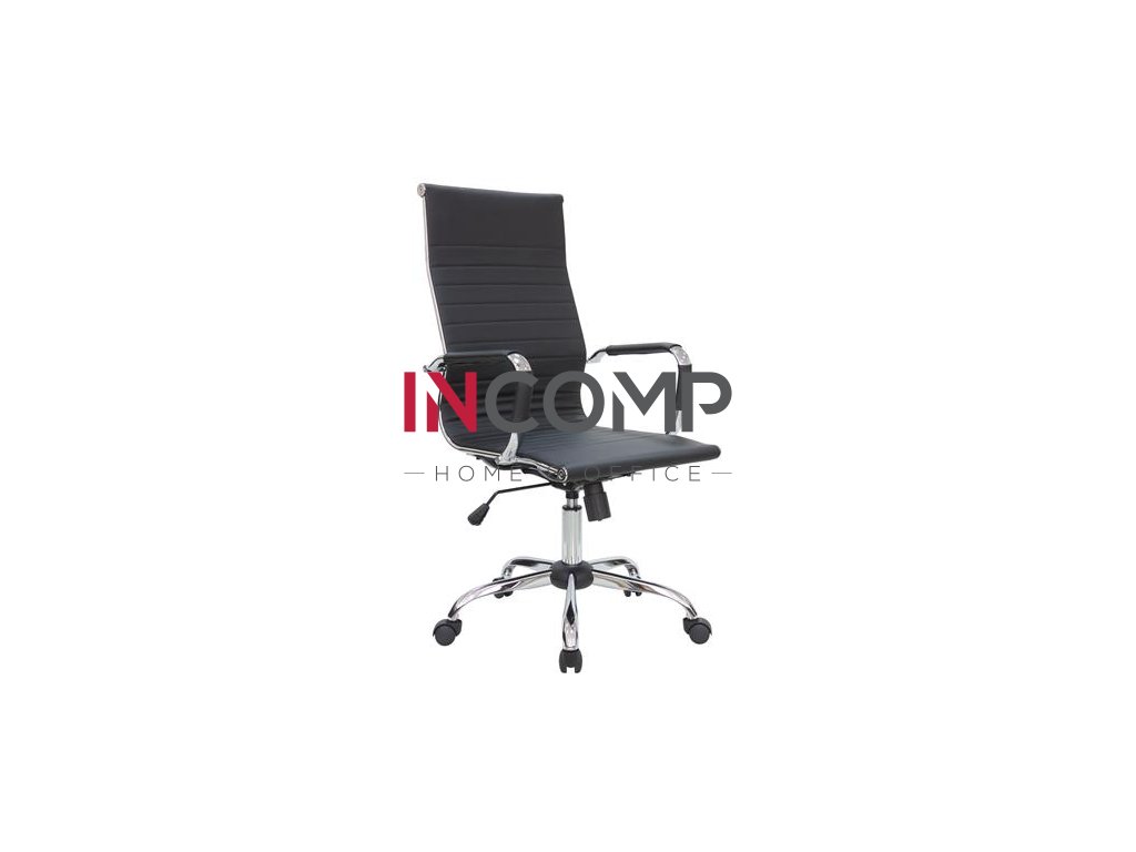 Kancelárska stolička s jedinečným dizajnom, mäkká textilná koža, vysoký operadlo, chrómované podrúčky s textilnou kožou, nastaviteľná hojdačka, chrómovaný plynový zdvih, chrómovaný krížový podstavec.
