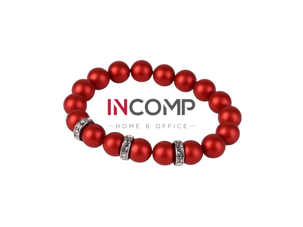 Originálny náramok vyrobený zo Swarovski® perál, zdobený bielymi Swarovski® rondellovými krištálmi. Perly majú červený odtieň. Ide o elegantnú farbu, vhodnú aj k slávnostnému oblečeniu. Náramok sa ľahko nasadzuje aj skladá, keďže je navlečený na elastickej šnúrke. Veľkosť M, približne 18,5 cm, čo je štandardná dámska veľkosť. Balenie obsahuje navliekaciu šnúrku a jednu náhradnú perlu. Balené v darčekovej krabičke.