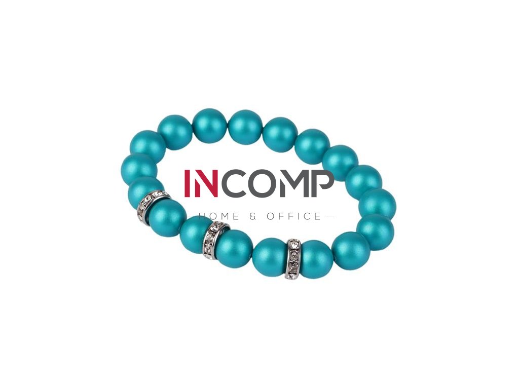 Originálny náramok vyrobený zo Swarovski® perál, zdobený bielymi Swarovski® rondellovými krištálmi. Perly majú tyrkysový odtieň. Ide o elegantnú farbu, vhodnú aj k slávnostnému oblečeniu. Náramok sa ľahko nasadzuje aj skladá, keďže je navlečený na elastickej šnúrke. Veľkosť M, približne 18,5 cm, čo je štandardná dámska veľkosť. Balenie obsahuje navliekaciu šnúrku a jednu náhradnú perlu. Balené v darčekovej krabičke.