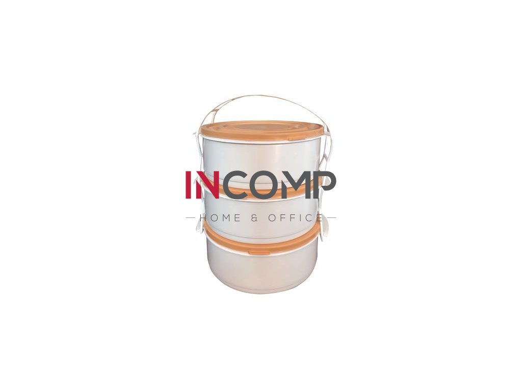 Trojdielny plastový obedár na potraviny s rôznofarebnými vekami a praktickou rukoväťou, ktorý drží tri časti pohromade počas prepravy a zdvíhania.