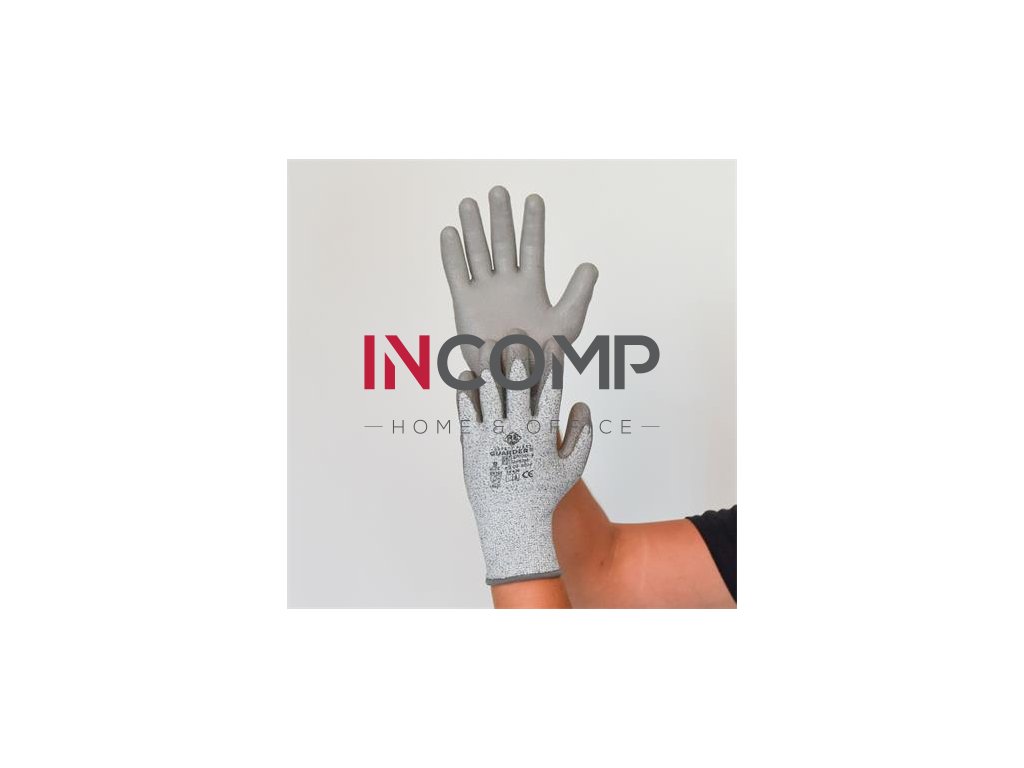 Päťprstové, sivé, proti porezaniu odolné rukavice, máčané v polyuretáne po celej dlani. -materiál: kruhovo pletený čierno-biely úplet z 13g HPPE + nylon + spandex + sklenené vlákno-s polyestrovou, pogumovanou manžetou -na dlani sivý polyuretánový záter -farba: sivá -veľkosť: 7/S -balené po pároch v jednotkovom balení -balenie: 1 pár/bal, 240 párov/karton -norma: EN ISO 21420:2020; EN 388:2016 4X43C
