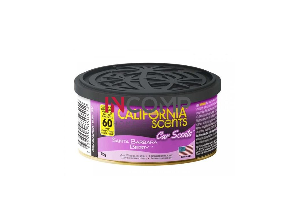 CALIFORNIA CAR SCENTS - SANTA BARBARA BERRY - plechovka s vôňou Čučoriedok rozvonia interiér vášho auta až na 60 dní. Produkt je absolútne bezpečný, nehrozí žiadny únik kvapaliny ani žiadne poškodenie plastových alebo iných dielov interiéru auta. Dodávané plastové viečko plechovky má integrovaný regulátor intenzity vône. Je biologicky odbúrateľný a ekologický.