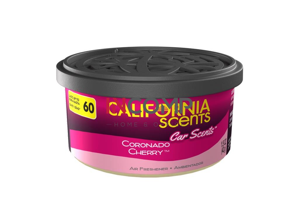 CALIFORNIA CAR SCENTS - CORONADO CHERRY - plechovka s vôňou Višní rozvonia interiér vášho auta až na 60 dní. Produkt je absolútne bezpečný, nehrozí žiadny únik kvapaliny ani žiadne poškodenie plastových alebo iných dielov interiéru auta. Dodávané plastové viečko plechovky má integrovaný regulátor intenzity vône. Je biologicky odbúrateľný a ekologický.