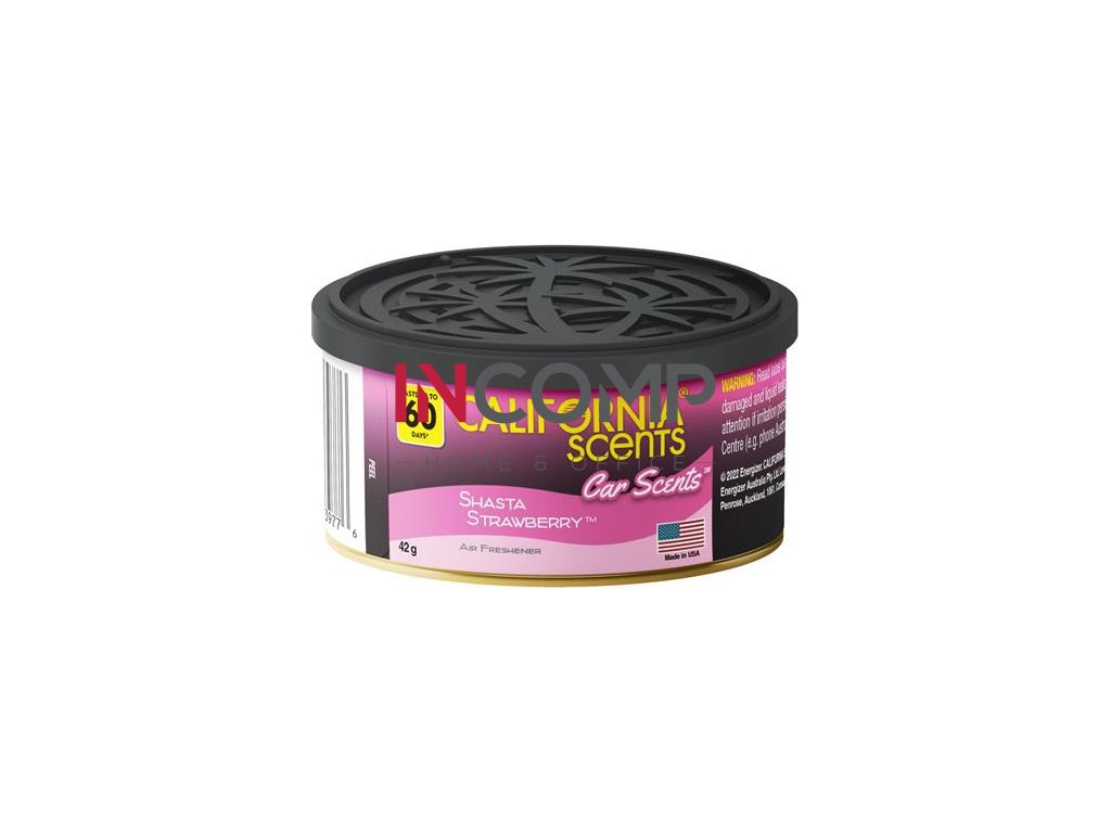 CALIFORNIA CAR SCENTS - SHASTA STRAWBERRY - plechovka s vôňou Čerstvých jahôd rozvonia interiér vášho auta až na 60 dní. Produkt je absolútne bezpečný, nehrozí žiadny únik kvapaliny ani žiadne poškodenie plastových alebo iných dielov interiéru auta. Dodávané plastové viečko plechovky má integrovaný regulátor intenzity vône. Je biologicky odbúrateľný a ekologický.