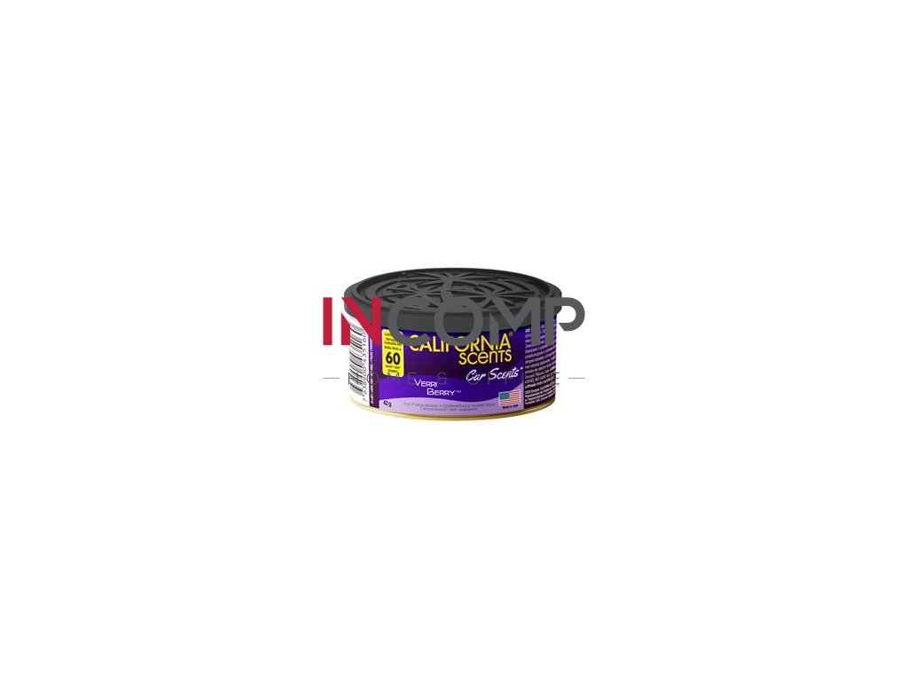 CALIFORNIA CAR SCENTS - VERRI BERRY - plechovka s vôňou "Ostružín" rozvonia interiér auta až na 60 dní. Produkt je absolútne bezpečný, nehrozí žiadny únik kvapaliny ani žiadne poškodenie plastových alebo iných dielov interiéru auta. Dodávané plastové viečko plechovky má integrovaný regulátor intenzity vône. Je biologicky odbúrateľný a ekologický.