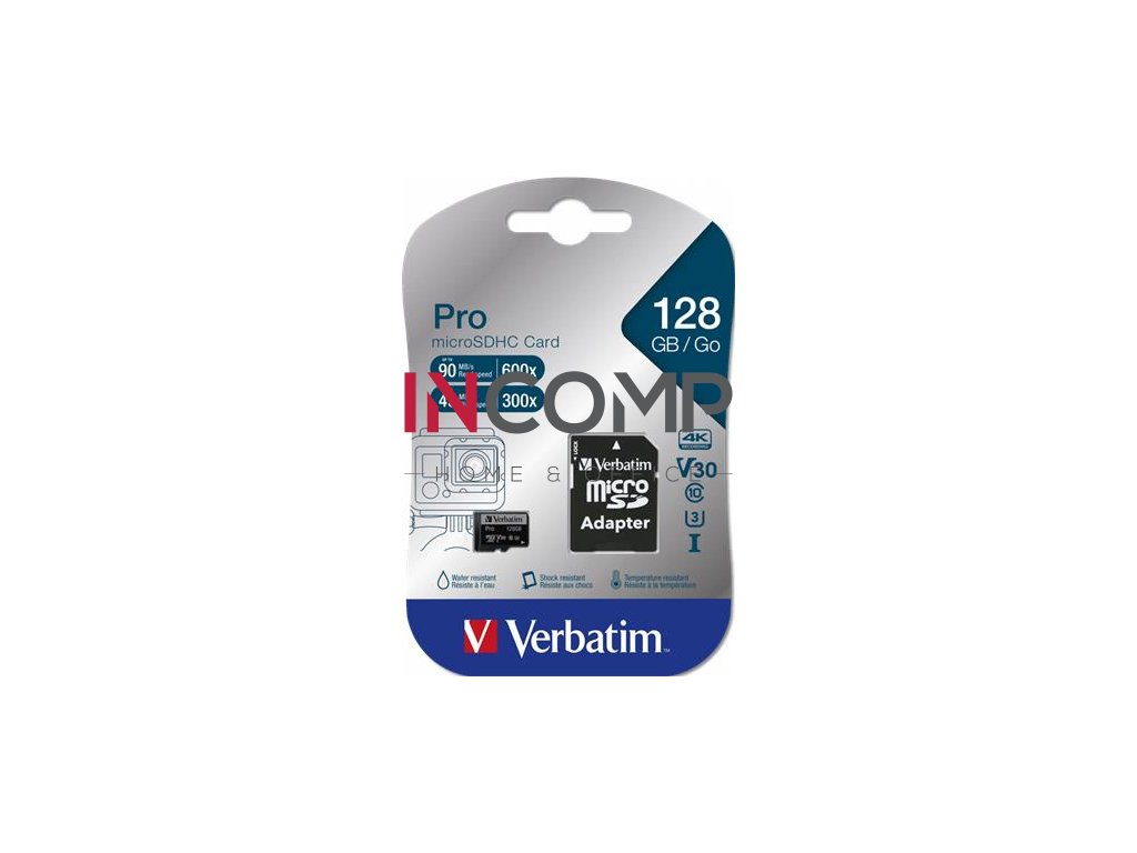 Pamäťová karta, microSDXC, 128 GB, CL10/U3, 90/45 MB/s, s adaptérom, VERBATIM "PRO"