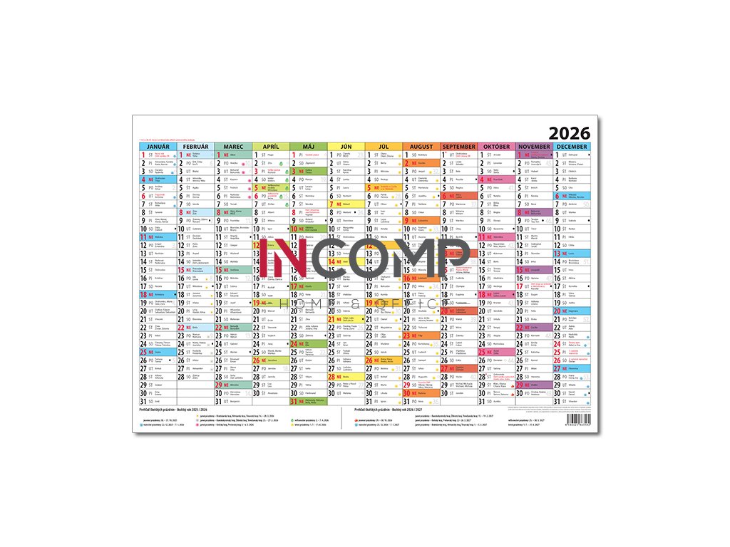 Jednolistový plánovací farebný kalendár obsahujúci menné kalendárium a termíny školských prázdnin na Slovensku.