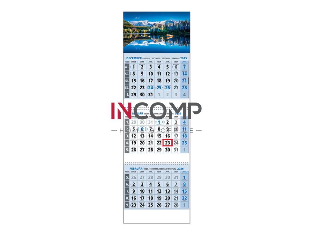 Trojdielny kalendár s menami v SK + CZ, názvy mesiacov a dní v SK, CZ, EN, DE a RU. Obrázok B