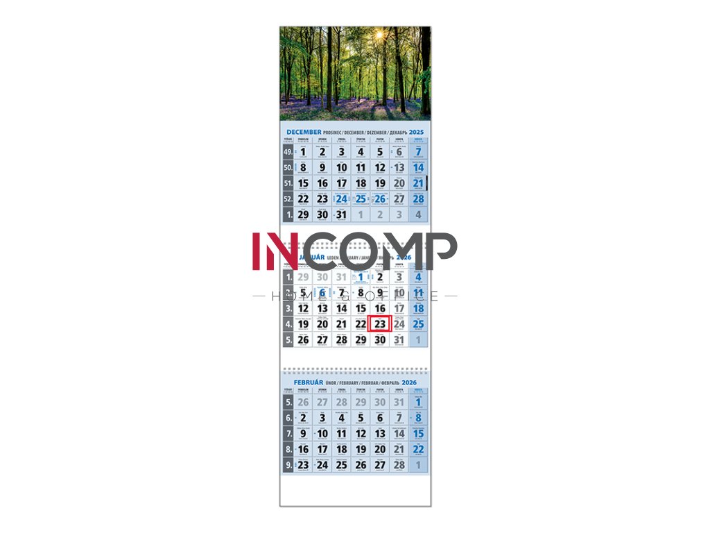 Trojdielny kalendár s menami v SK + CZ, názvy mesiacov a dní v SK, CZ, EN, DE a RU. Obrázok E
