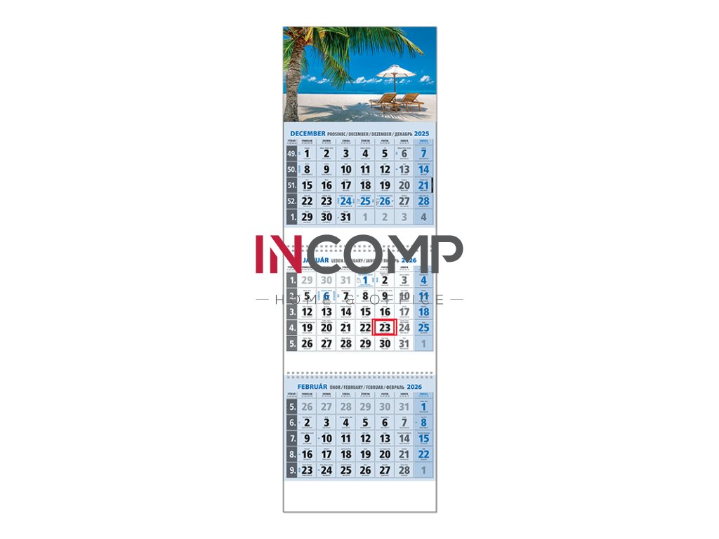 Trojdielny kalendár s menami v SK + CZ, názvy mesiacov a dní v SK, CZ, EN, DE a RU. Obrázok F