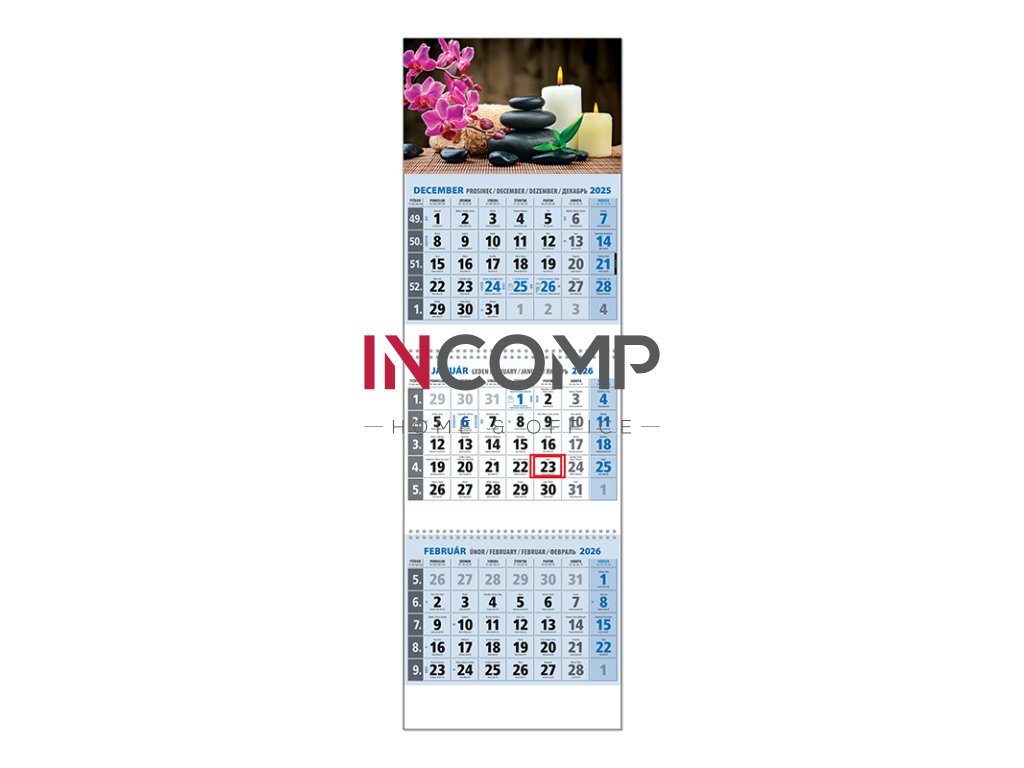 Trojdielny kalendár s menami v SK + CZ, názvy mesiacov a dní v SK, CZ, EN, DE a RU. Obrázok G