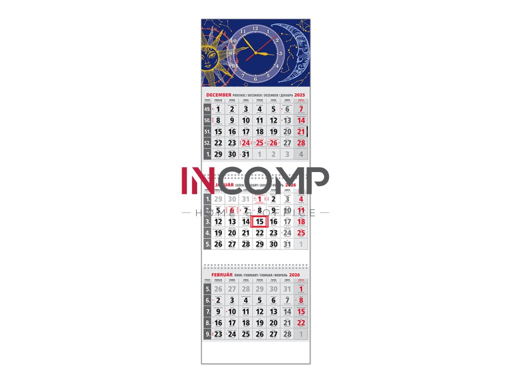 Trojdielny kalendár s menami v SK + CZ, názvy mesiacov a dní v SK, CZ, EN, DE a RU. Hodinky QK