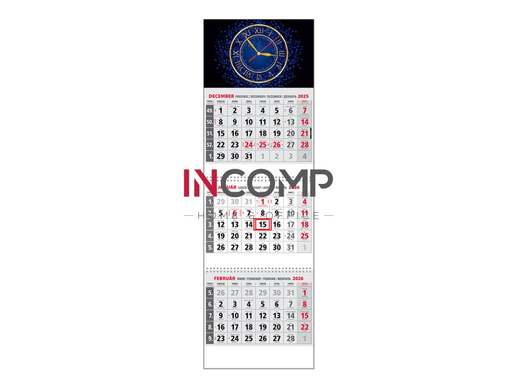 Trojdielny kalendár s menami v SK + CZ, názvy mesiacov a dní v SK, CZ, EN, DE a RU. Hodinky QL