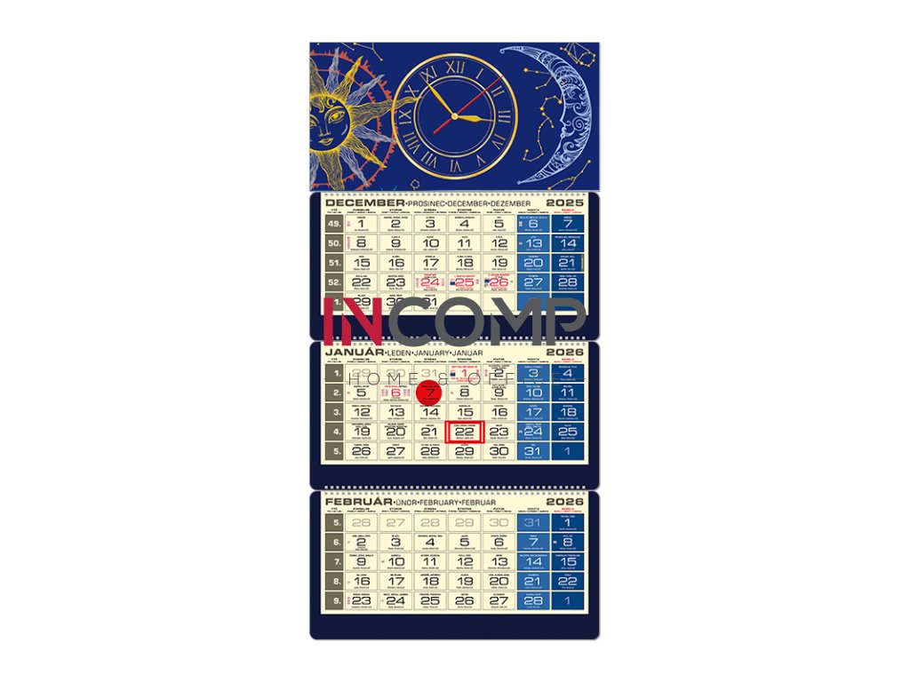 Luxusný trojdielny kalendár s menami v SK + CZ, názvy mesiacov a dní v SK, CZ, UK a DE. Súčasťou kalendárov LUXUS je "elektrostatický označovač" a 13. list s prehľadom všetkých sviatkov EÚ. Hodiny QS