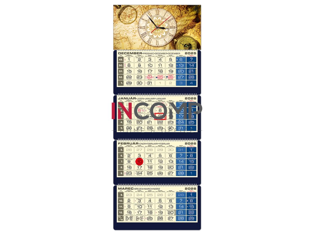 Luxusný štvordielny kalendár s menami v SK + CZ, názvy mesiacov a dní v SK, CZ, UK a DE. Súčasťou kalendárov LUXUS je "elektrostatický označovač" a 13. list s prehľadom všetkých sviatkov EÚ. Hodiny QN