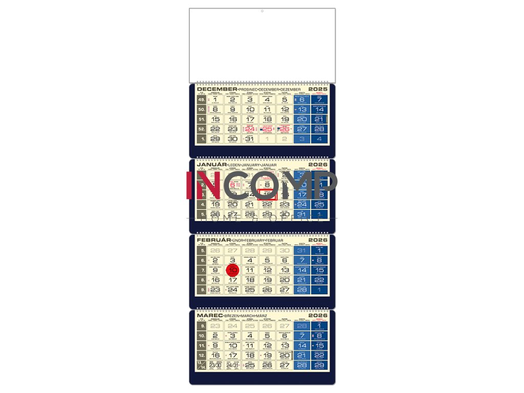 Luxusný štvordielny kalendár s menami v SK + CZ, názvy mesiacov a dní v SK, CZ, UK a DE. Súčasťou kalendárov LUXUS je "elektrostatický označovač" a 13. list s prehľadom všetkých sviatkov EÚ.