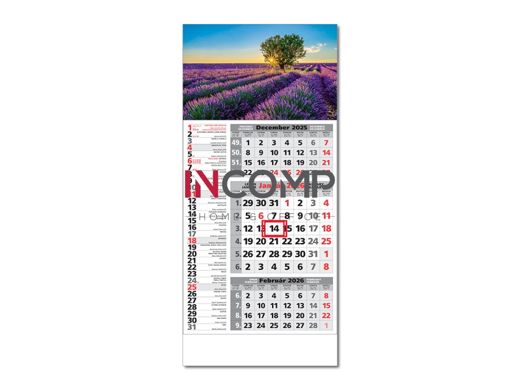 Plánovací 3-mesačný sivý kalendár s priloženou hornou čistou lištou, s menami v SK + CZ, názvy mesiacov a dní v SK, CZ, UK, DE a HU. Obrázok C