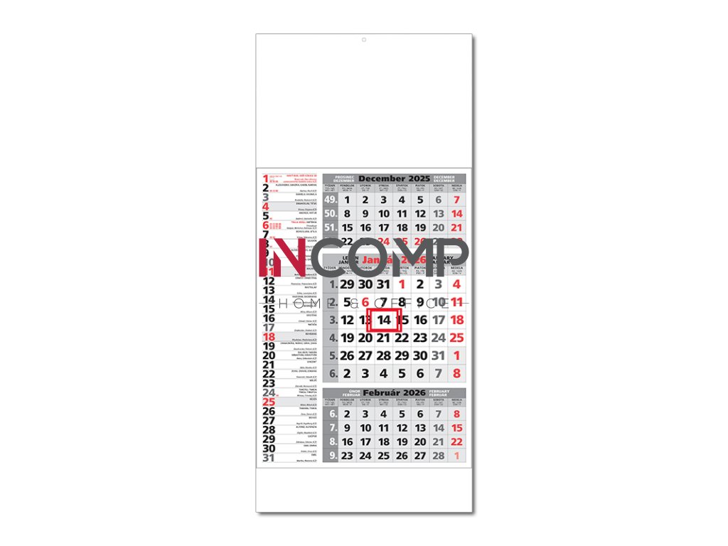Plánovací 3-mesačný sivý kalendár s priloženou hornou čistou lištou, s menami v SK + CZ, názvy mesiacov a dní v SK, CZ, UK, DE a HU.