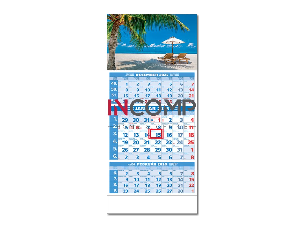 Plánovací 3-mesačný modrý kalendár s priloženou hornou čistou lištou, s menami v SK + CZ, názvy mesiacov a dní v SK, CZ, UK, DE a HU. . Možnosť výberu obrázku. Obrázok F