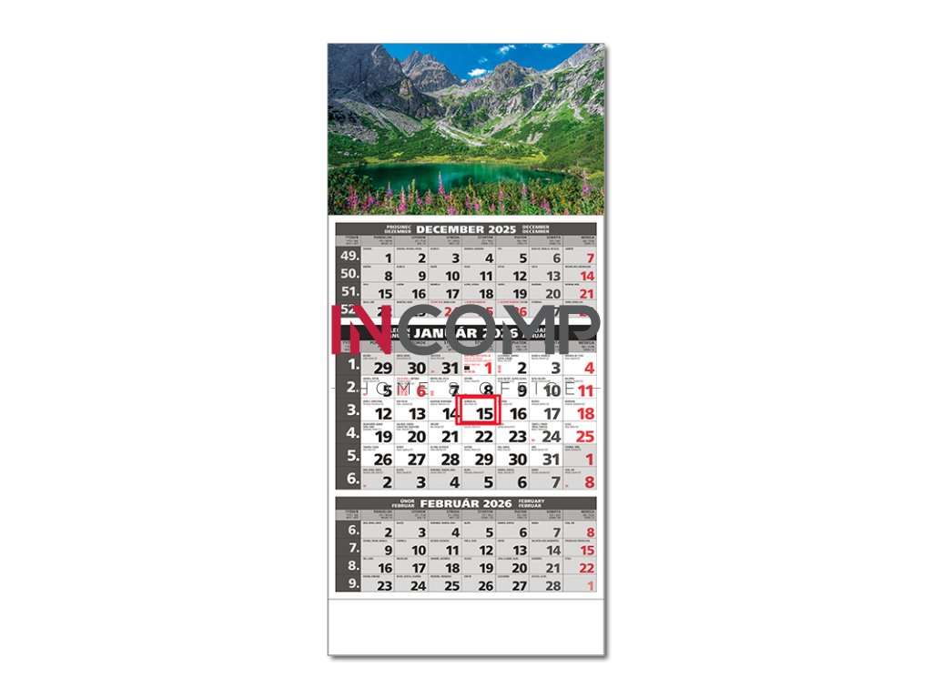 Plánovací 3-mesačný sivý kalendár s priloženou hornou čistou lištou, s menami v SK + CZ, názvy mesiacov a dní v SK, CZ, UK, DE a HU. Možnosť výberu obrázku. Obrázok A