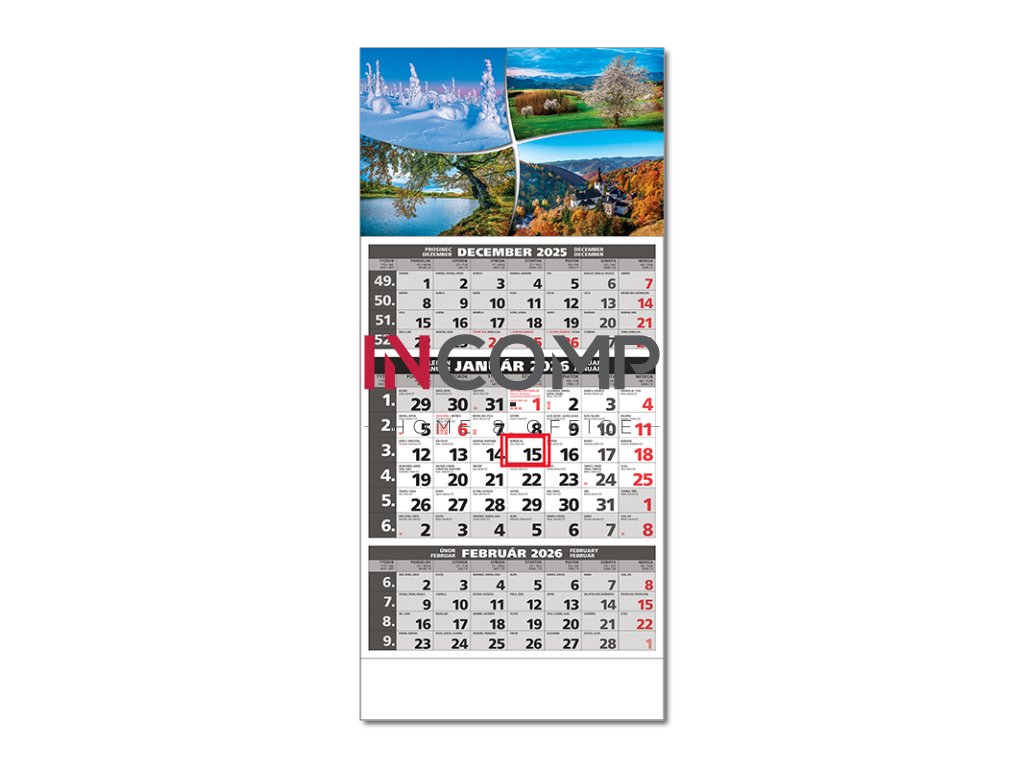 Plánovací 3-mesačný sivý kalendár s priloženou hornou čistou lištou, s menami v SK + CZ, názvy mesiacov a dní v SK, CZ, UK, DE a HU. Možnosť výberu obrázku. Obrázok D