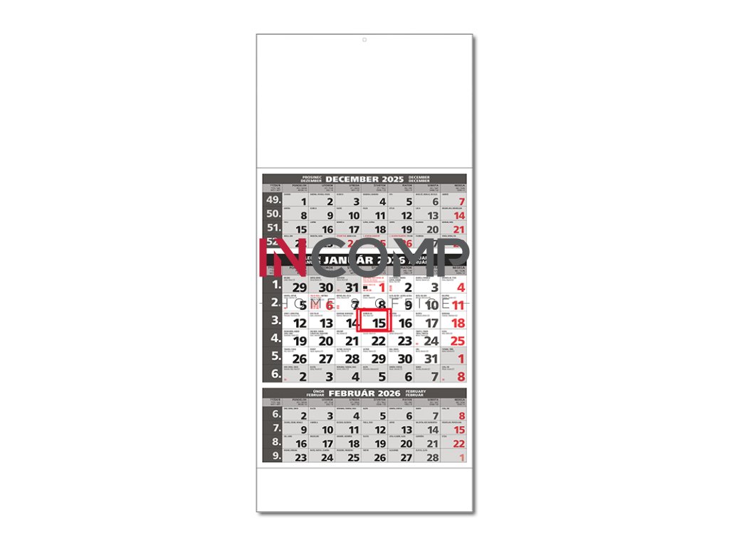Plánovací 3-mesačný sivý kalendár s priloženou hornou čistou lištou, s menami v SK + CZ, názvy mesiacov a dní v SK, CZ, UK, DE a HU. Možnosť výberu obrázku.