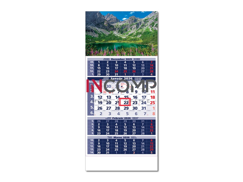 Plánovací kalendár so 4-mesačným kalendáriom s menami v SK, názvy mesiacov a dní v SK, CZ, EN, DE a HU. Obrázok A