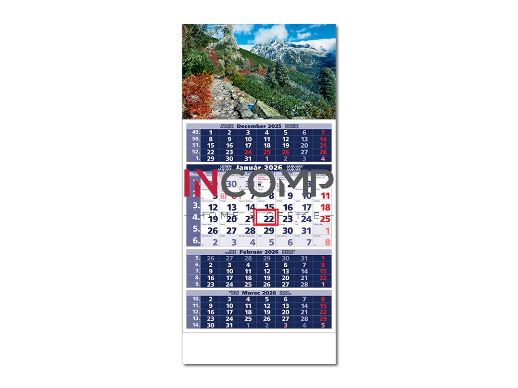 Plánovací kalendár so 4-mesačným kalendáriom s menami v SK, názvy mesiacov a dní v SK, CZ, EN, DE a HU. Obrázok H
