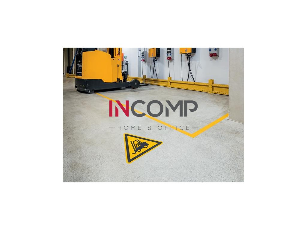 Použitie: samolepiaca bezpečnostná značka pre vnútorné podlahové povrchy, určená na označenie nebezpečných oblastí, napríklad v skladoch, distribučných centrách a výrobných závodoch