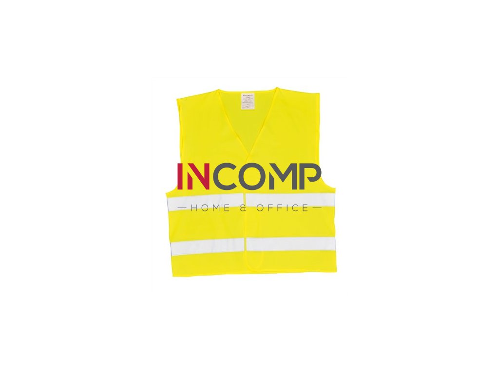 vzdušný, polyesterový materiál, dobre viditeľná žltá farba, so svetloodrážajúcimi pásikmi, veľkosť nastaviteľná pomocou suchého zipsu, zodpovedá normám EU