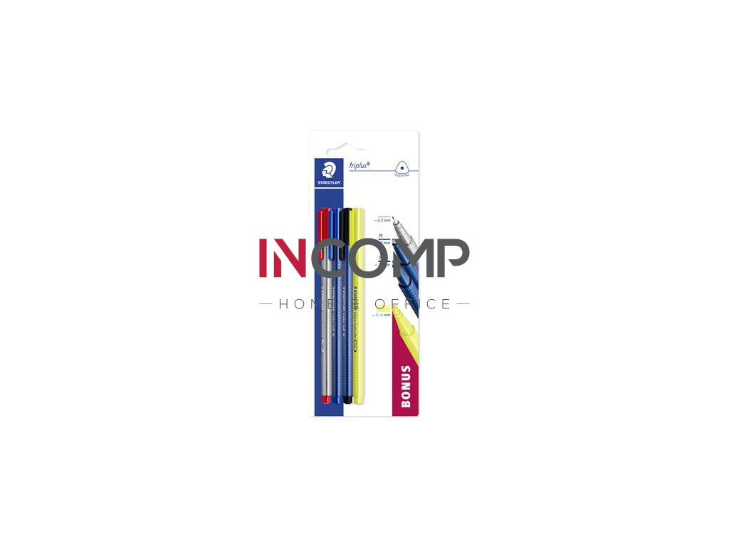 Sada Triplus, ktorá obsahuje 1 ks tenkého fixu (0,3 mm) v červenej farbe, 2 ks guľôčkových pier (M) v modrej a čiernej farbe a 1 ks žltého zvýrazňovača (1-4 mm).