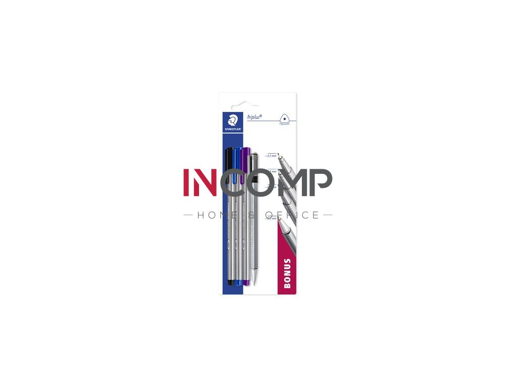 Sada Triplus, ktorá obsahuje 3 ks tenkých fixiek (0,3 mm) v čiernej, modrej a fialovej farbe a 1 ks mechanickej ceruzky (0,5 mm).
