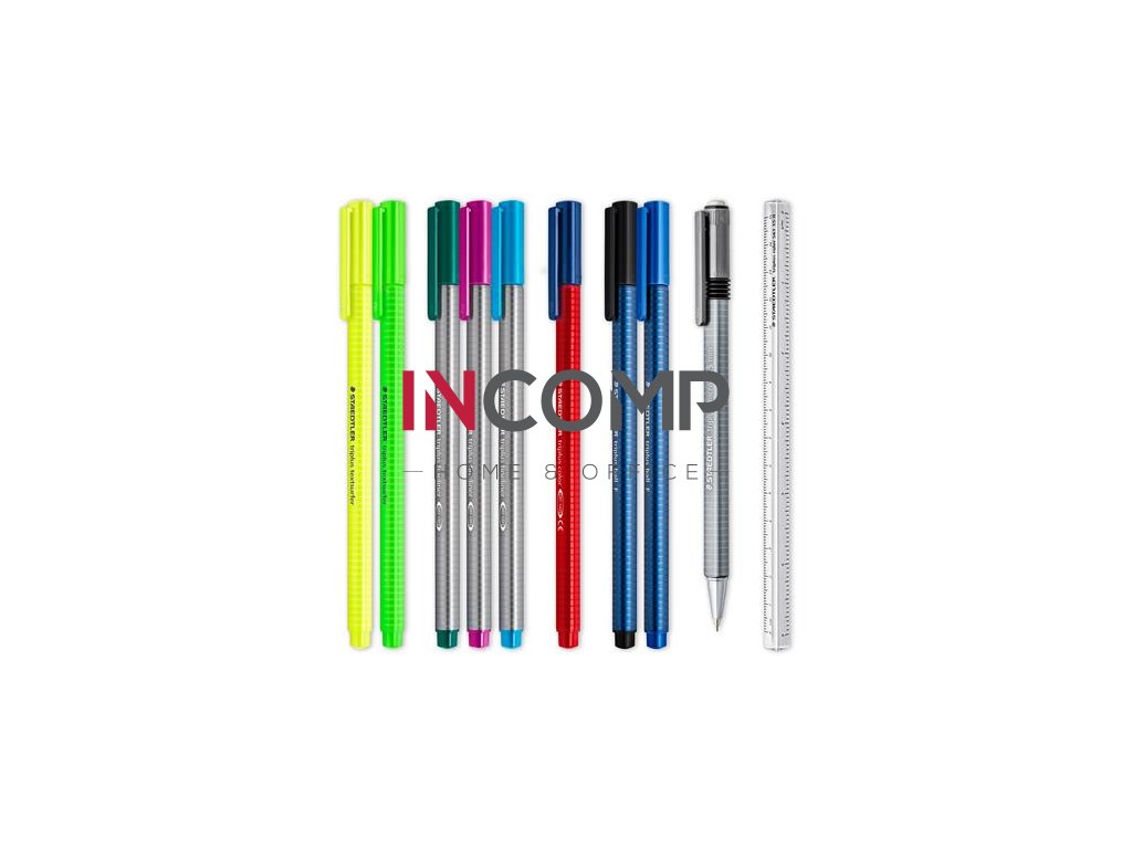 - sada obsahuje: 2 guľôčkové perá "Triplus" (čierne a modré), 1 červené pero, 3 linery, 2 textové zvýrazňovače, 1 mikroceruzka, 1 pravítko